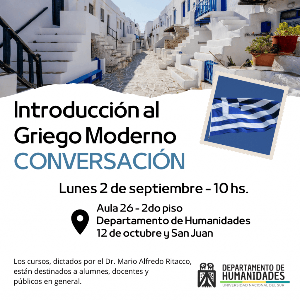 Los cursos cuatrimestrales de lengua griega moderna se dictan para estudiantes, docentes y trabajadores no docentes de la UNS, y están abiertos también para el público en general. Están a cargo del profesor Mario Ritacco, docente del Área de Historia Antigua y Medieval de nuestro Departamento, Licenciado en Historia por la Universidad Nacional del Sur y Doctor en Arqueología por la Universidad Nacional y Kapodistríaca de Atenas.